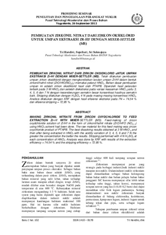 Handini, Tri and Suprihati, Suprihati and Sukmajaya, Sri (2012) PEMBUATAN ZIRKONIL NITRAT DARI ZIRKON OKSIKLORID UNTUK UMPAN EKSTRAKSI ZR-HF DENGAN MIXER-SETTLER (MS). ROSIDING SEMINAR PENELITIAN DAN PENGELOLAAN PERANGKAT NUKLIR Pusat Teknologi Akselerator dan Proses Bahan. pp. 102-106. ISSN 1410 – 8178