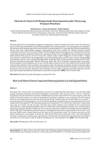 Budi, Santosa and Henna, Ria Sunoko and Andri, Sukeksi (2015) Ekstrak air daun padi memperbaiki hematopoesis pada tikus yang terpajan plumbum. Majalah Kedokteran Bandung, 47 (2): 4. pp. 84-90. ISSN 0126-074X