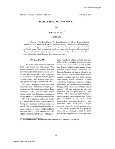Indra, Aswandy (1990) Sekilas tentang Tanaidacea. OSEANA, 15 (2): 4. pp. 85-92. ISSN 0216-1877