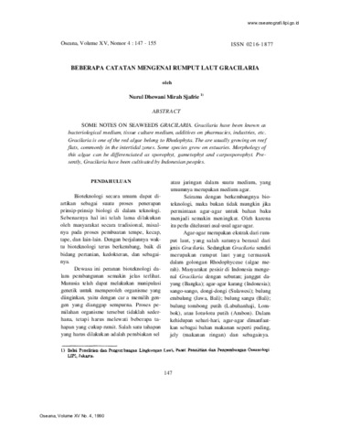 Nurul, Dhewani Mirah Sjafrie (1990) Beberapa catatan mengenai rumput laut Gracilaria. OSEANA, 15 (4): 2. pp. 147-155. ISSN 0216-1877