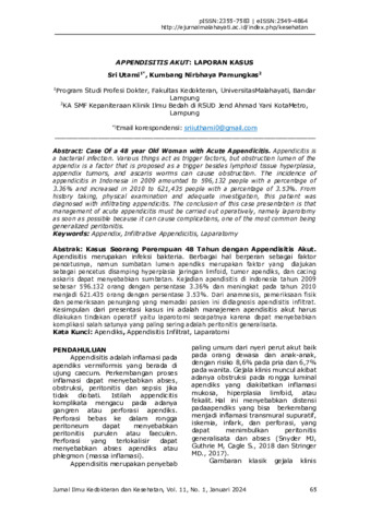 Sri, Utami and Kumbang, Nirbhaya Pamungkas (2024) Appendisitis akut: Laporan kasus. Jurnal Ilmu Kedokteran dan Kesehatan, 11 (1). pp. 65-70. ISSN 2355-7583