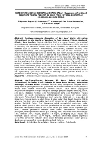 I Nyoman, Bagus Aji Kresnapati and Muhammad, Eka Putra Ramandha and Sri, Winarni Sofya (2024) Antihiperglikemia rebusan air daun salam (Syzygium polyanthum) terhadap profil pekerja Di Desa Paok Motong, Kecamatan Masbagik, Lombok Timur. Jurnal Ilmu Kedokteran dan Kesehatan, 11 (1). pp. 71-82. ISSN 2355-7583