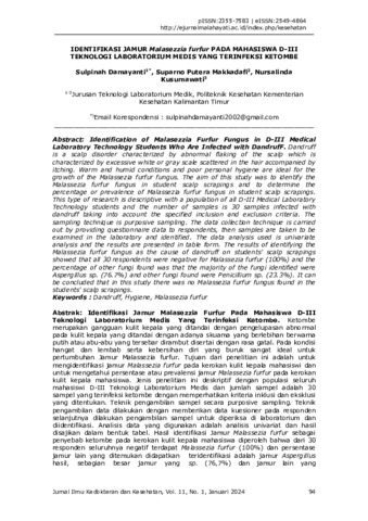 Sulpinah, Damayanti and Suparno, Putera Makkadaf and Nursalinda, Kusumawat (2024) Identifikasi jamur Malasezzia furfur pada mahasiswa D-III Teknologi Laboratorium Medis yang terinfeksi ketombe. Jurnal Ilmu Kedokteran dan Kesehatan, 11 (1). pp. 94-99. ISSN 2355-7583