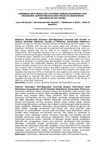 Laura, BS Huwae and Rachmawati, Dwi Agustin and Alessandra, F Saija and Johan, B Bension (2024) Hubungan self-regulated learning dengan kecemasan pada mahasiswa Kepaniteraan Klinik Fakultas Kedokteran Universitas Pattimura. Jurnal Ilmu Kedokteran dan Kesehatan, 11 (1). pp. 100-107. ISSN 2355-7583