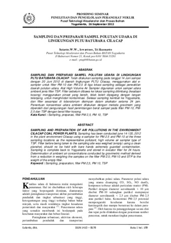 W Wardhana, Sutanto and Iswantoro, Iswantoro and Rusmanto, Tri (2012) SAMPLING DAN PREPARASI SAMPEL POLUTAN UDARA DI LINGKUNGAN PLTU BATUBARA CILACAP. PROSIDING SEMINAR PENELITIAN DAN PENGELOLAAN PERANGKAT NUKLIR Pusat Teknologi Akselerator dan Proses Bahan. pp. 199-203. ISSN 1410 – 8178