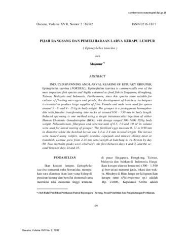 Mayunar, Mayunar (1992) Pijah rangsang dan pemeliharaan larva kerapu lumpur (Epinephelus tauvina). OSEANA, 17 (2): 4. pp. 69-82. ISSN 0216-1877