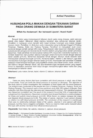 Miftah, Nur Andamsari and Nur, Indrawati Lipoeto and Husnil, Kadri (2015) Hubungan pola makan dengan tekanan darah pada orang dewasa di Sumatera Barat. Majalah Kedokteran Andalas, 38 (1): 4. pp. 17-22. ISSN 0126-2092