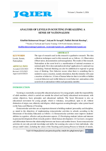 Khafifah, Rahmawani Siregar and Setiyani, Br Saragih and Padilah, Hoiriah Harahap (2024) Analysis of levels in scouting in realizing a sense of nationalism. Journal of Quality Islamic Education Research, 1 (1). pp. 48-57. ISSN 3047-0854