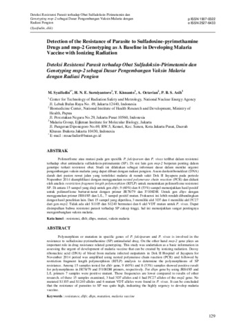 Polimorfisme atau mutasi pada gen spesifik P. falciparum dan P. vivax terlibat dalam resistensi terhadap obat antimalaria sulfadoksin-pirimetamin (SP). Di sisi lain gen msp-2 berperan penting dalam genotipe terkait resistensi obat. Studi ini dilakukan sebagai informasi dasar dalam menilai urgensi pengembangan vaksin malaria yang dapat dibuat dengan radiasi pengion. Asam deoksiribonukleat (DNA) darah dari pasien rawat jalan yang terinfeksi malaria di rumah sakit Dok II Jayapura pada periode Nopember 2014 diamplifikasi dengan menggunakan nested polymerase chain reaction (PCR) dan diikuti oleh analisis restriction fragment length polymorphism (RFLP) untuk menentukan polimorfisme resistensi SP. Di antara 15 sampel yang diuji untuk gen dhfr, 9 (60%) dan 8 (53%) sampel menunjukkan hasil positif untuk polimorfisme berturut-turut dengan primer JR78/79 dan F/108DH. Untuk gen dhps dengan menggunakan primer JR84/85 dan L/L,7 sampel positif mutan. Frekuensi ini lebih rendah dibandingkan dengan hasil penelitian lain. Dari 15 sampel yang diperiksa, 3 memiliki alel 3D7 dan 4 memiliki alel FC27 dari gen msp2.Tidak ada alel S1105 dan S1240 bermutasi dan 6 alel VDT mutan untuk P. vivax. Dapat disimpulkan bahwa resistensi parasit terhadap SP cukup tinggi, hal ini menunjukkan sangat pentingnya mengembangkan vaksin malaria.