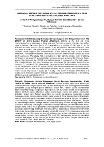 Arlita, Tri Wahyuniningsih and Nungki, Marlian Yuliadarwati and Safun, Rahmanto (2024) Hubungan antara dukungan sosial dengan kemandirian pada lansia di Griya Lansia Husnul Khatimah. Jurnal Ilmu Kedokteran dan Kesehatan, 11 (3). pp. 509-517. ISSN 2355-7583