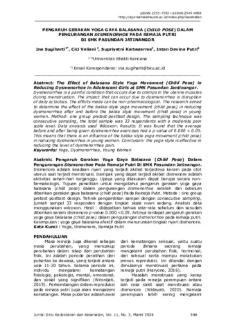Ina, Sugiharti and Cici, Valiani and Supriyatni, Kartadarma and Intan, Davina Putri (2024) Pengaruh gerakan yoga gaya nalasana (child pose) dalam pengurangan dismenorhoe pada remaja putri di SMK Pasundan Jatinangor. Jurnal Ilmu Kedokteran dan Kesehatan, 11 (3). pp. 544-549. ISSN 2355-7583