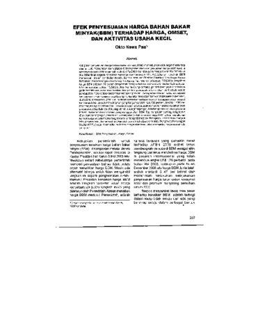 Okto, Nawa Pau (2009) Efek penyesuaian harga Bahan Bakar Minyak (BBM) terhadap harga, omset, dan aktivitas usaha kecil. Jurnal Bisnis dan Manajemen, 1 (2): 11. pp. 287-293. ISSN 1979-8946