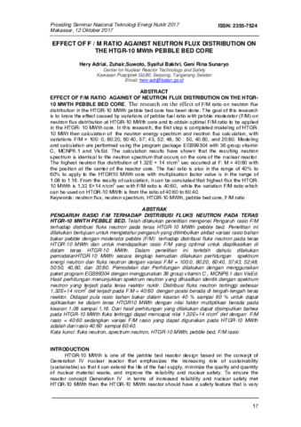 Hery Adrial, HA and Suwoto, AW and Zuhair, Z and Syaiful Bakhri, SB (2017) EFFECT OF F / M RATIO AGAINST NEUTRON FLUX DISTRIBUTION ON THE HTGR-10 MWth PEBBLE BED CORE. EFFECT OF F / M RATIO AGAINST NEUTRON FLUX DISTRIBUTION ON THE HTGR-10 MWth PEBBLE BED CORE. pp. 17-28. ISSN 2355-7524
