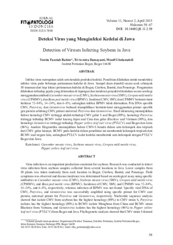 Infeksi virus merupakan salah satu kendala produksi kedelai. Penelitian dilakukan untuk mendeteksi infeksi virus pada beberapa pertanaman kedelai di Jawa. Sampel daun diambil secara acak sebanyak 50 tanaman dari tiap lokasi pertanaman kedelai di Bogor, Cirebon, Bantul, dan Ponorogo. Pengamatan dilakukan terhadap gejala yang ditemukan di lapangan dan insidensi penyakit ditentukan secara serologi menggunakan antibodi Cucumber mosaic virus (CMV), Soybean mosaic virus (SMV), Cowpea mild mottle virus (CPMMV), dan Bean pod mottle virus (BPMV). Insidensi CMV, SMV, dan CPMMV berturut-turut berkisar 72–84%, 14–24%, dan 6–8%; sedangkan infeksi BPMV tidak ditemukan. Pita DNA spesifik CMV, Potyvirus, dan Geminivirus berhasil diamplifikasi berturut-turut menggunakan primer spesifik gen protein selubung CMV, primer universal Potyvirus dan Geminivirus. Hasil sikuensing menunjukkan bahwa homologi CMV tertinggi adalah terhadap CMV galur S asal Bogor (99%), homologi Potyvirus tertinggi terhadap BCMV isolat kacang hijau asal Cina dan galur Blackeye asal Vietnam (90%), dan homologi Geminivirus tertinggi terhadap Pepper yellow leaf curl virus (PYLCV) asal Bogor dan Jawa (96%). Analisis filogenetika menunjukkan bahwa CMV-S berada dalam satu kelompok dan terpisah dari CMV galur lainnya. BCMV pada kedelai dalam penelitian ini membentuk kelompok terpisah dari BCMV asal negara lain, sedangkan PYLCV isolat kedelai membentuk satu kelompok dengan PYLCV Bogor dan Jawa.