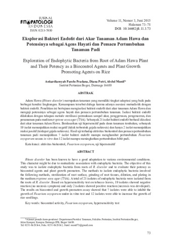 Ankardiansyah, Pandu Pradana and Diana, Putri and Abdul, Munif (2015) Eksplorasi bakteri endofit dari akar tanaman adam hawa dan potensinya sebagai agens hayati dan pemacu pertumbuhan tanaman padi. Jurnal Fitopatologi Indonesia, 11 (3): 1. pp. 73-78. ISSN 0215-7950