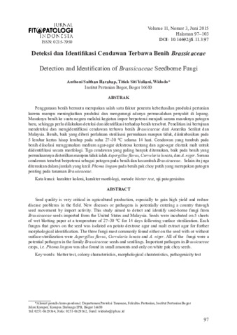 Anthoni, Sulthan Harahap and Titiek, Siti Yuliani and Widodo, Widodo (2015) Deteksi dan identifikasi cendawan terbawa benih Brassicaceae. Jurnal Fitopatologi Indonesia, 11 (3): 5. pp. 97-103. ISSN 0215-7950