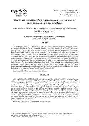 Nematoda puru akar (NPA), Meloidogyne spp. merupakan salah satu patogen penting pada tanaman padi di beberapa wilayah di dunia. Informasi mengenai NPA pada tanaman padi di Jawa Barat penting untuk diketahui karena Jawa Barat merupakan salah satu sentra produksi padi nasional yang paling besar. Tujuan penelitian ialah menentukan keberadaan dan mengidentifikasi NPA pada tanaman padi di wilayah Jawa Barat. Sampel tanaman padi diambil dari 7 kabupaten penghasil padi di Jawa Barat. Gejala khas tanaman padi yang terinfeksi oleh Meloidogyne spp. ialah pertumbuhan tanaman terhambat dan bagian akarnya terbentuk puru. Hasil pengamatan di lapangan menunjukkan bahwa NPA ditemukan menginfeksi tanaman padi di beberapa daerah di wilayah Bogor, Cirebon, dan Sukabumi. Semua stadium perkembangan NPA yang meliputi telur; larva instar ke-2, 3, dan 4; betina dewasa dan jantan dewasa ditemukan di dalam jaringan akar padi. Berdasarkan pengukuran panjang tubuh, panjang stilet, lebar badan maksimum, dan panjang ekor larva instar ke-2 maupun morfologi pola perineal betina dewasa dibuktikan bahwa nematoda pada akar padi ialah M. graminicola.