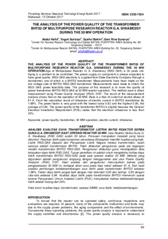 Abdul Hafid, AH and Teguh Sulistyo, TS and Syaiful Bakhri, SB and Geni Rina Sunaryo, GRS (2017) THE ANALYSIS OF THE POWER QUALITY OF THE TRANSFORMER BHT03 OF MULTIPURPOSE RESEARCH REACTOR G.A. SIWABESSY DURING THE 30MW OPERATION. THE ANALYSIS OF THE POWER QUALITY OF THE TRANSFORMER BHT03 OF MULTIPURPOSE RESEARCH REACTOR G.A. SIWABESSY DURING THE 30MW OPERATION. pp. 69-76. ISSN 2355-7524