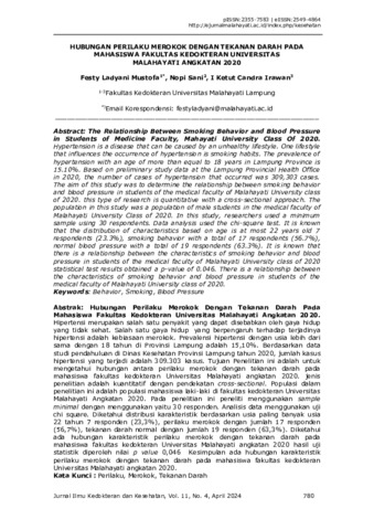 Festy, Ladyani Mustofa and Nopi, Sani and I Ketut, Candra Irawan (2024) Hubungan perilaku merokok dengan tekanan darah pada mahasiswa Fakultas Kedokteran Universitas Malahayati Angkatan 2020. Jurnal Ilmu Kedokteran dan Kesehatan, 11 (4). pp. 780-787. ISSN 2355-7583
