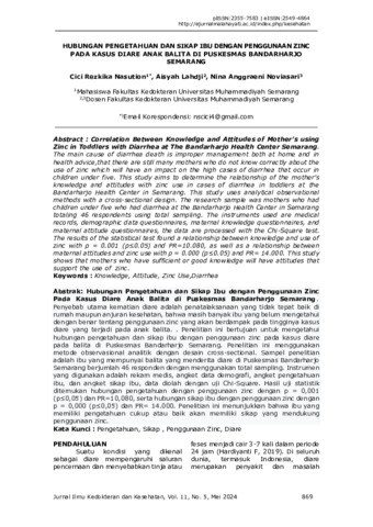 Cici, Rezkika Nasution and Aisyah, Lahdji and Nina, Anggraeni Noviasari (2024) Hubungan pengetahuan dan sikap ibu dengan penggunaan zinc pada kasus diare anak balita di Puskesmas Bandarharjo Semarang. Jurnal Ilmu Kedokteran dan Kesehatan, 11 (5). ISSN 2355-7583