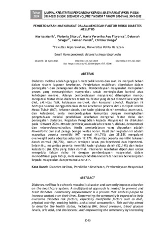 Marisa, Manik and Fiolenty x, Manik and Maria, Veronika Ayu Florensa and Deborah, Siregar and Herman, Pailak and Chriska, Sinaga (2024) Pemberdayaan masyarakat dalam mencegah faktor risiko Diabetes mellitus. Jurnal Kreativitas Pengabdian kepada Masyarakat, 7 (7). pp. 3043-3052. ISSN 2615-0921