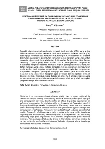 Ferry, Ferry and Wijonarko, Wijonarko (2024) Pencegahan penyakit DM dan komplikasinya melalui pengenalan bahan makanan yang aman di RT 01 LK 02 kelurahan Tanjung Raya kota Bandar Lampung. Jurnal Kreativitas Pengabdian kepada Masyarakat, 7 (7). pp. 3068-3078. ISSN 2615-0921