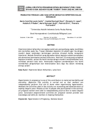 Maria, Conchita Leyla Centis and Imelda, Rosniyati Dewi and Dionesia, O. Laput and Natalia, D.P Raden and Maria, Delvasari Multi and Patrisia, Efrin and Theresia, Putriandini (2024) Pembuatan perasan labu siam untuk mengatasi hipertensi dalam kehamilan. Jurnal Kreativitas Pengabdian kepada Masyarakat, 7 (7). pp. 3096-3106. ISSN 2615-0921