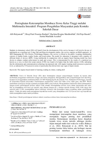 Afib, Rulyansah and Rizqi, Putri Nourma Budiarti and Rachma, Rizqina Mardhotillah and Edi, Pujo Basuki and Surnia, Maulidah Azzahra (2022) Peningkatan keterampilan membaca siswa kelas tinggi melalui multimedia interaktif: program pengabdian masyarakat pada konteks sekolah dasar. Indonesia Berdaya, 3 (4). pp. 905-914. ISSN 2721-0669
