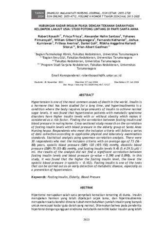 Robert, Kosasih and Frisca, Frisca and Alexander, Halim Santoso and Yohanes, Firmansyah and William, Gilbert Satyanegara and Fernando, Nathaniel and Joshua, Kurniawan and Friliesa, Averina and Daniel, Goh and Ribkha, Anggeline Hariesti Sitorus and Brian, Albert Gaofman (2024) Hubungan kadar insulin puasa dengan tekanan darah pada kelompok lanjut usia: studi potong lintang di Panti Santa Anna. Manuju: Malahayati Nursing Journal, 6 (7). pp. 2613-2620. ISSN 2655-2728