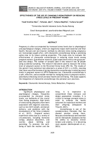 Yosef, Andrian Beo and Yohanes, Jakri and Yohana, Hepilita and Yuliana, Suryati (2024) Effectiveness of the use of Chamomile aromatherapy on reducing stress levels in pregnant women. Manuju: Malahayati Nursing Journal, 6 (7). pp. 2629-2635. ISSN 2655-2728