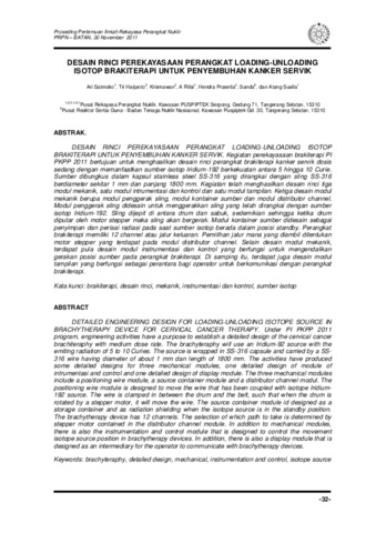 DESAIN RINCI PEREKAYASAAN PERANGKAT LOADING-UNLOADING ISOTOP BRAKITERAPI UNTUK PENYEMBUHAN KANKER SERVIK. Kegiatan perekayasaan brakiterapi PI PKPP 2011 bertujuan untuk menghasilkan desain rinci perangkat brakiterapi kanker servik dosis sedang dengan memanfaatkan sumber isotop Iridium-192 berkekuatan antara 5 hingga 10 Curie. Sumber dibungkus dalam kapsul stainless steel SS-316 yang dirangkai dengan sling SS-316 berdiameter sekitar 1 mm dan panjang 1800 mm. Kegiatan telah menghasilkan desain rinci tiga modul mekanik, satu modul intrumentasi dan kontrol dan satu modul tampilan. Ketiga desain modul mekanik berupa modul penggerak sling, modul kontainer sumber dan modul distributor channel. Modul penggerak sling didesain untuk menggerakkan sling yang telah dirangkai dengan sumber isotop Iridium-192. Sling dijepit di antara drum dan sabuk, sedemikian sehingga ketika drum diputar oleh motor stepper maka sling akan bergerak. Modul kontainer sumber didesain sebagai penyimpan dan perisai radiasi pada saat sumber isotop berada dalam posisi standby. Perangkat brakiterapi memiliki 12 channel atau jalur keluaran. Pemilihan jalur mana yang diambil ditentukan motor stepper yang terdapat pada modul distributor channel. Selain desain modul mekanik, terdapat pula desain modul instrumentasi dan kontrol yang berfungsi untuk mengendalikan gerakan posisi sumber pada perangkat brakiterapi. Di samping itu, terdapat juga desain modul tampilan yang berfungsi sebagai perantara bagi operator untuk berkomunikasi dengan perangkat brakiterapi.