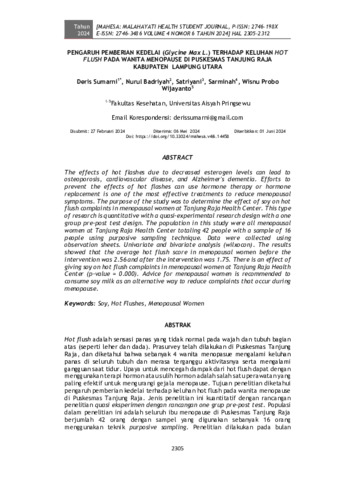 Deris, Sumarni and Nurul, Badriyah and Satriyani, Satriyani and Sarminah, Sarminah and Wisnu, Probo Wijayanto (2024) Pengaruh pemberian kedelai (Glycine max L.) terhadap keluhan hot flush pada wanita menopause di Puskesmas Tanjung Raja Kabupaten Lampung Utara. MAHESA: Malahayati Health Student Journal, 4 (6): 17. pp. 2305-2312. ISSN 2746-198X