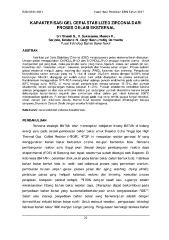Fabrikasi gel Ceria Stabilized Zirkonia (CSZ) melalui proses gelasi eksternal telah dilakukan. Umpan gelasi menggunakan Ce(NO3)3.6H2O dan ZrO(NO3)2.2H2O sebagai material utama. Untuk memperoleh gel yang baik, maka parameter kunci yang harus dipenuhi antara lain adalah pH sol, kosentrasi dan viskositas umpan, frekuensi, amplitude dan flowrate aliran umpan. Proses setelah gelasi eksternal meliputi aging, washing dan drying (AWD), kalsinasi dan sintering. Pengukuran konduktivitas cairan pencuci yang ke 7, nilai di bawah 20µS/cm setara dengan 0,001% berat kandungan NH4OH, dianggap gel sudah cukup baik untuk dilanjutkan ke proses selanjutnya. Karakterisasi menggunakan DTA-TGA menunjukkan adanya puncak endotermis pada suhu sekitar 80oC hingga suhu 189oC, di mana terjadi pengurangan massa sebesar 18,75%, dan puncak eksotermis, terjadi pengurangan massa sebesar 11,34%. Puncak endotermis terdeteksi karena adanya penguapan air dan sisa ammonia dalam gel, sedangkan puncak eksotermis karena terjadi dekomposisi bahan-bahan organik dan ammonium nitrat dalam gel. Hasil kalsinasi 500oC menghasilkan spektrum IR dengan frekuensi vibrasi pada nilai yang dimiliki gugus fungsi hidroksil, nitrat, cerium dan zirkonium oksida. Kernel CSZ tersinter menghasilkan difraktogram berupa senyawa Zirconium Cerium Oxide dengan struktur kristal tetragonal.
