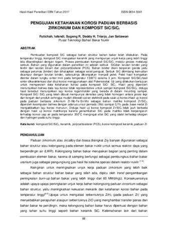 Pembuatan komposit SiC sebagai bahan struktur bahan bakar telah dilakukan. Pada temperatur tinggi, komposit SiC merupakan keramik yang mempunyai unjuk kerja yang lebih tinggi bila dibandingkan dengan logam. Proses pembuatan komposit SiC/SiCf melalui proses metalurgi serbuk. Bahan yang digunakan dalam penelitian ini adalah serbuk SiCdan larutan binder yang terdiri dari larutan toluen dan polycarbosilane (PCS). Bahan binder disini berperan ganda yaitu sebagai pelumas (binder) dan diharapkan sebagai serat penguat. Serbuk SiC ditimbang kemudian dicampur dengan larutan binder, selanjutnya dikompakan menjadi pelet. Pelet hasil kompakan disinter dalam tungku sinter mini pada temperatur 1300oC selama 3 jam. Komposit SiC/SiCfhasil sinter dikarakterisasi dan diuji korosi menggunakaan alat Potensiostat. Uji yang dilakukan bertujuan untuk memperoleh data ketahanan korosi pada komposit SiC/ SiCf. Hasil yang diperoleh menunjukkan bahwa data laju korosi tidak representative untuk sampel komposit SiC/SiCf, diduga hasil tersebut menunjukkan laju korosi logamholder yang berada di dalam mounting sampel. Komposit SiC/ SiCf yang telah dibuat mempunyai densitas yang tidak homogen antara posisi tepi dan tengah dari produk sehingga mudah dilewati cairan elektrolit pada saat uji korosi.Hasil uji korosi pada paduan berbasis zirkonium Zr-Nb-Fe-Sn-Mo sebagai bahan matriks komposit Zr/SiCf, diperoleh kesimpulan bahwa dengan adanya unsur pemadu (Mo) sampai 0,1% pada base metal Zr mengakibatkan laju korosi menurun. Diduga hasil uji korosi komposit Zr/SiCf tidak jauh berbeda dengan hasil uji korosi matriksnya karena penambahan SiC pada matriks tidak berpengaruh terhadap korosi uap air pada temperatur 350oC mengingat sifat SiC yang stabil terhadap oksigen dan hydrogen pada suhu tinggi.