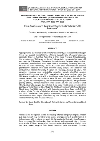 Dimas, Arya Sentana and Sukandriani, Utami and Shinta, Wulandari and Ali, Sukamajaya (2024) Hubungan kualitas tidur, tingkat stres dan pola makan dengan Gula Darah Sewaktu (GDS) pada mahasiswa fakultas kedokteran Universitas Islam Al-Azhar angkatan 2022 dan 2023. MAHESA: Malahayati Health Student Journal, 4 (6): 23. pp. 2361-2373. ISSN 2746-198X