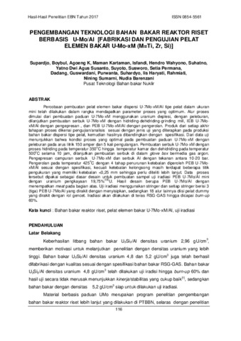 Supardjo, Supardjo and Boybul, Boybul and Kadarjono, Agoeng and Kartaman Ajiriyanto, Maman and Isfandi, Isfandi and Wahyono, Hendro and Suhatno, Suhatno and Dwi A.S., Yatno and Suyoto, Suyoto and Susworo, Susworo and Permana, Setia and Dadang, Dadang and Guswardani, Guswardai and Purwanta, Purwanta and Suhardyo, Suhardyo and Haryati, Iis and Rahmiati, Rahmiati and Sumarni, Nining and Barenzani, Nudia (2018) PENGEMBANGAN TEKNOLOGI BAHAN BAKAR REAKTOR RISET BERBASIS U-Mo/Al [FABRIKASI DAN PENGUJIAN PELAT ELEMEN BAKAR U-Mo-xM (M=Ti, Zr, Si)]. Prosiding Seminar Hasil-hasil Penelitian EBN Tahun 2017, - (-). pp. 116-129. ISSN 0854-5561