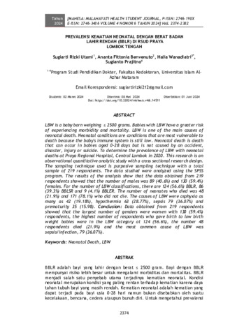 Sugiarti, Rizki Utami and Ananta, Fittonia Benvenuto and Halia, Wanadiatri and Sugianto, Prajitno (2024) Prevalensi kematian neonatal dengan Berat Badan Lahir Rendah (BBLR) di RSUD Praya Lombok Tengah. MAHESA: Malahayati Health Student Journal, 4 (6): 24. pp. 2374-2382. ISSN 2746-198X
