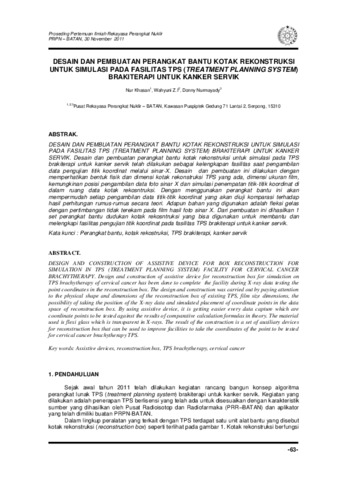 Khasan, Nur and Imran, Wahyuni and Nurmayadi, Donny (2011) DESAIN DAN PEMBUATAN PERANGKAT BANTU KOTAK REKONSTRUKSI UNTUK SIMULASI PADA FASILITAS TPS (TREATMENT PLANNING SYSTEM) BRAKITERAPI UNTUK KANKER SERVIK. In: Proseding Pertemuan Ilmiah Rekayasa Perangkat Nuklir, 30 Nopember 2011, Pusat Rekayasa Perangkat Nuklir, Kawasan PUSPIPTEK Serpong, Gedung 71, Tangerang Selatan, 15310.