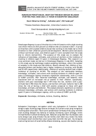 Desni, Oktavina Ginting and Zulhaida, Lubis and Etti, Sudaryati (2024) Hubungan pengetahuan, sikap dan tindakan dengan kejadian stunting pada anak usia 2-5 tahun di Kabupaten Simalungun. MAHESA: Malahayati Health Student Journal, 4 (6): 28. pp. 2431-2445. ISSN 2746-198X
