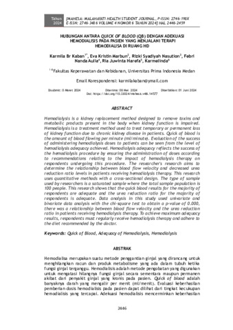 Karmila, Br Kaban and Eva, Kristin Marbun and Rizki, Syadiyah Nasution and Febri, Nanda Aulia and Ria, Juwinta Harefa and Karmelinda, Karmelinda (2024) Hubungan antara Quick of Blood (QB) dengan adekuasi hemodialisis pada pasien yang menjalani terapi hemodialisa di ruang HD. MAHESA: Malahayati Health Student Journal, 4 (6): 29. pp. 2446-2459. ISSN 2746-198X
