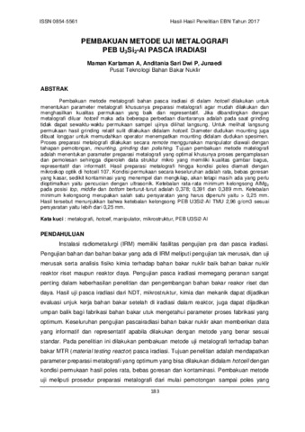 Pembakuan metode metalografi bahan pasca iradiasi di dalam hotcell dilakukan untuk menentukan parameter metalografi khususnya preparasi metalografi agar mudah dilakukan dan menghasilkan kualitas permukaan yang baik dan representatif. Jika dibandingkan dengan metalografi diluar hotcell maka ada beberapa perbedaan diantaranya adalah pada saat grinding tidak dapat sewaktu-waktu permukaan sampel ujinya dilihat langsung. Untuk melihat langsung permukaan hasil grinding relatif sulit dilakukan didalam hotcell. Diameter dudukan mounting juga dibuat longgar untuk memudahkan operator menempatkan mounting didalam dudukan spesimen. Proses preparasi metalografi dilakukan secara remote menggunakan manipulator diawali dengan tahapan pemotongan, mounting, grinding dan polishing. Tujuan pembakuan metode matelografi adalah menentukan paramater preparasi metalografi yang optimal khusunya proses pengamplasan dan pemolesan sehingga diperoleh data struktur mikro yang memiliki kualitas gambar bagus, representatif dan informatif. Hasil preparasi metalografi hingga kondisi poles diamati dengan mikroskop optik di hotcell 107. Kondisi permukaan secara keseluruhan adalah rata, bebas goresan yang kasar, sedikit kontaminasi yang menempel dan mengkilap, akan tetapi masih ada yang perlu dioptimalkan yaitu pencucian dengan ultrasonik. Ketebalan rata-rata minimum kelongsong AlMg2 pada posisi top, middle dan bottom berturut-turut adalah 0,378; 0,391 dan 0,389 mm. Ketebalan minimum kelongsong merupakan salah satu persyaratan yang harus dipenuhi yaitu > 0,25 mm. Hasil tersebut menunjukkan bahwa ketebalan kelongsong PEB U3Si2-Al TMU 2,96 g/cm3 sesuai persyaratan yaitu lebih dari 0,25 mm.