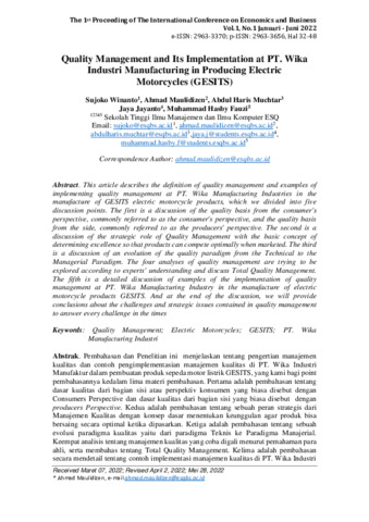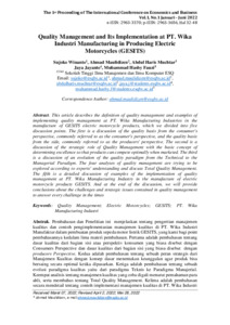 This article describes the definition of quality management and examples ofimplementing quality management at PT. Wika Manufacturing Industries in themanufacture of GESITS electric motorcycle products, which we divided into five discussion points. The first is a discussion of the quality basis from the consumer's perspective, commonly referred to as the consumer's perspective, and the quality basis from the side, commonly referred to as the producers' perspective. The second is a discussion of the strategic role of Quality Management with the basic concept of determining excellence so that products can compete optimally when marketed. The third is a discussion of an evolution of the quality paradigm from the Technical to the Managerial Paradigm. The four analyses of quality management are trying to be explored according to experts' understanding and discuss Total Quality Management.The fifth is a detailed discussion of examples of the implementation of quality management at PT. Wika Manufacturing Industry in the manufacture of electric motorcycle products GESITS. And at the end of the discussion, we will provide conclusions about the challenges and strategic issues contained in quality management to answer every challenge in the times