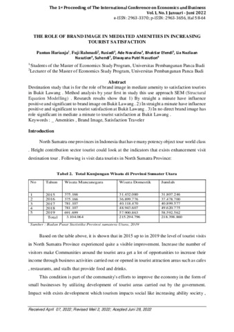 Pantun, Harianja and Fuji, Rahmadi and Rusiadi, Rusiadi and Ade, Novalina and Bhaktiar, Efendi and Lia, Nazliaan Nasution and Suhendi, Suhendi and Diwayana, Putri Nasution (2022) The role of brand image in mediated amenities in increasing tourist satisfaction. In: The 1st Proceeding of The International Conference on Economics and Business.