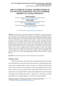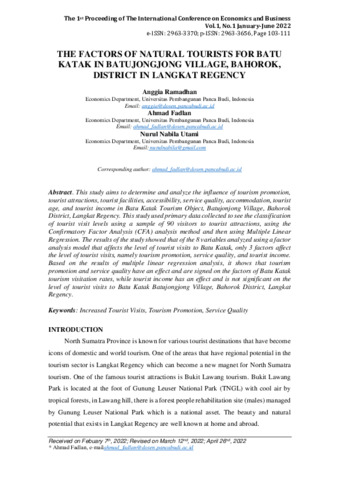 Anggia, Ramadhan and Ahmad, Fadlan and Nurul, Nabila Utami (2022) The factors of natural tourists for Batu Katak in Batujongjong Village, Bahorok, District in Langkat Regency. In: The 1st Proceeding of The International Conference on Economics and Business.