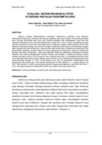 Asep Fathudin and Saud Maruli Tua and Haris Gunawan (2018) EVALUASI SISTEM PENANGKAL PETIR DI GEDUNG INSTALASI RADIOMETALURGI. Prosiding Seminar Hasil-hasil Penelitian EBN Tahun 2017, - (-). pp. 247-258. ISSN 0854-5561