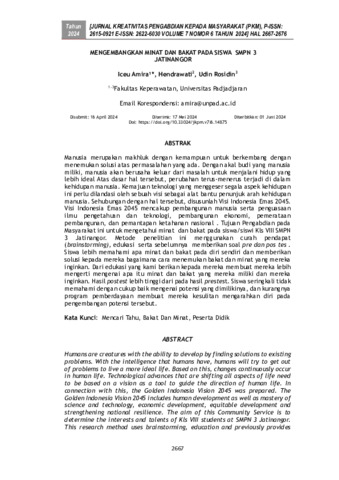 Manusia merupakan makhluk dengan kemampuan untuk berkembang dengan menemukan solusi atas permasalahan yang ada. Dengan akal budi yang manusia miliki, manusia akan berusaha keluar dari masalah untuk menjalani hidup yang lebih ideal Atas dasar hal tersebut, perubahan terus-menerus terjadi di dalam kehidupan manusia. Kemajuan teknologi yang menggeser segala aspek kehidupan ini perlu dilandasi oleh sebuah visi sebagai alat bantu penunjuk arah kehidupan manusia. Sehubungan dengan hal tersebut, disusunlah Visi Indonesia Emas 2045. Visi Indonesia Emas 2045 mencakup pembangunan manusia serta penguasaan ilmu pengetahuan dan teknologi, pembangunan ekonomi, pemerataan pembangunan, dan pemantapan ketahanan nasional . Tujuan Pengabdian pada Masyarakat ini untuk mengetahui minat dan bakat pada siswa/siswi Kls VIII SMPN 3 Jatinangor. Metode penelitian ini menggunakan curah pendapat (brainstorming), edukasi serta sebelumnya memberikan soal pre dan pos tes . Siswa lebih memahami apa minat dan bakat pada diri sendiri dan memberikan solusi kepada mereka bagaimana cara menemukan bakat dan minat yang mereka inginkan. Dari edukasi yang kami berikan kepada mereka membuat mereka lebih mengerti mengenai apa itu minat dan bakat yang mereka miliki dan mereka inginkan. Hasil postest lebih tinggi dari pada hasil prestest. Siswa seringkali tidak memahami dengan cukup baik mengenai potensi yang dimilikinya, dan kurangnya program pemberdayaan membuat mereka kesulitan mengarahkan diri pada pengembangan potensi tersebut.