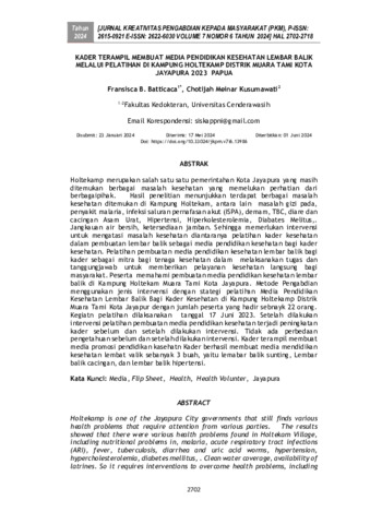 Fransisca, B. Batticaca and Chotijah, Meinar Kusumawati (2024) Kader terampil membuat media pendidikan kesehatan lembar balik melalui pelatihan di Kampung Holtekamp Distrik Muara Tami Kota Jayapura 2023 Papua. Jurnal Kreativitas Pengabdian kepada Masyarakat, 7 (6): 33. pp. 2702-2718. ISSN 2615-0921
