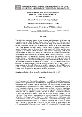 Ikhwani, Ikhwani and Fiki, Setiawan and Hery, Prambudi (2024) Skrining bank darah untuk pemeriksaan hepatitis C di Kelurahan Tukmudal Kecamatan Sumber. Jurnal Kreativitas Pengabdian kepada Masyarakat, 7 (6): 35. pp. 2728-2737. ISSN 2615-0921