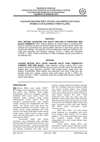 Setiawan, Budi and Purnomo, Dwi (2012) Validasi Metode HPLC Untuk Analisis Sulfit Pada Pembuatan Kandidat SRM Na2ZrO3. Prosiding Seminar Penelitian Dan Pengelolaan Perangkat Nuklir. pp. 18-22. ISSN 1410 – 8178