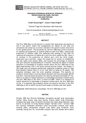 Endah, Mulyaningsih and Sukarni, Setya Ningsih (2024) Pengaruh pendidikan kesehatan terhadap pengetahuan ibu hamil tentang 1000 hari pertama kehidupan. Manuju: Malahayati Nursing Journal, 6 (6): 6. pp. 2223-2233. ISSN 2655-2728